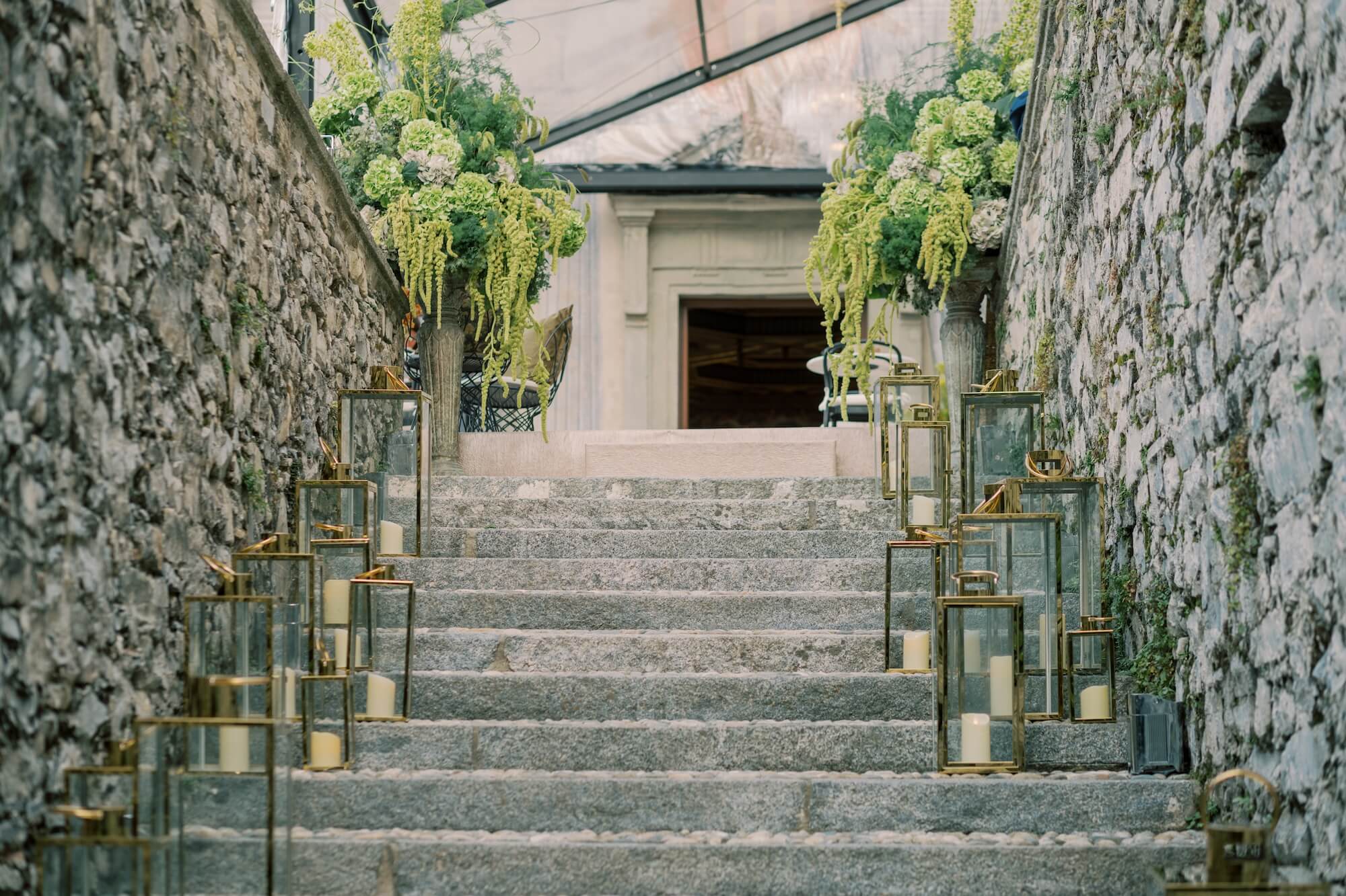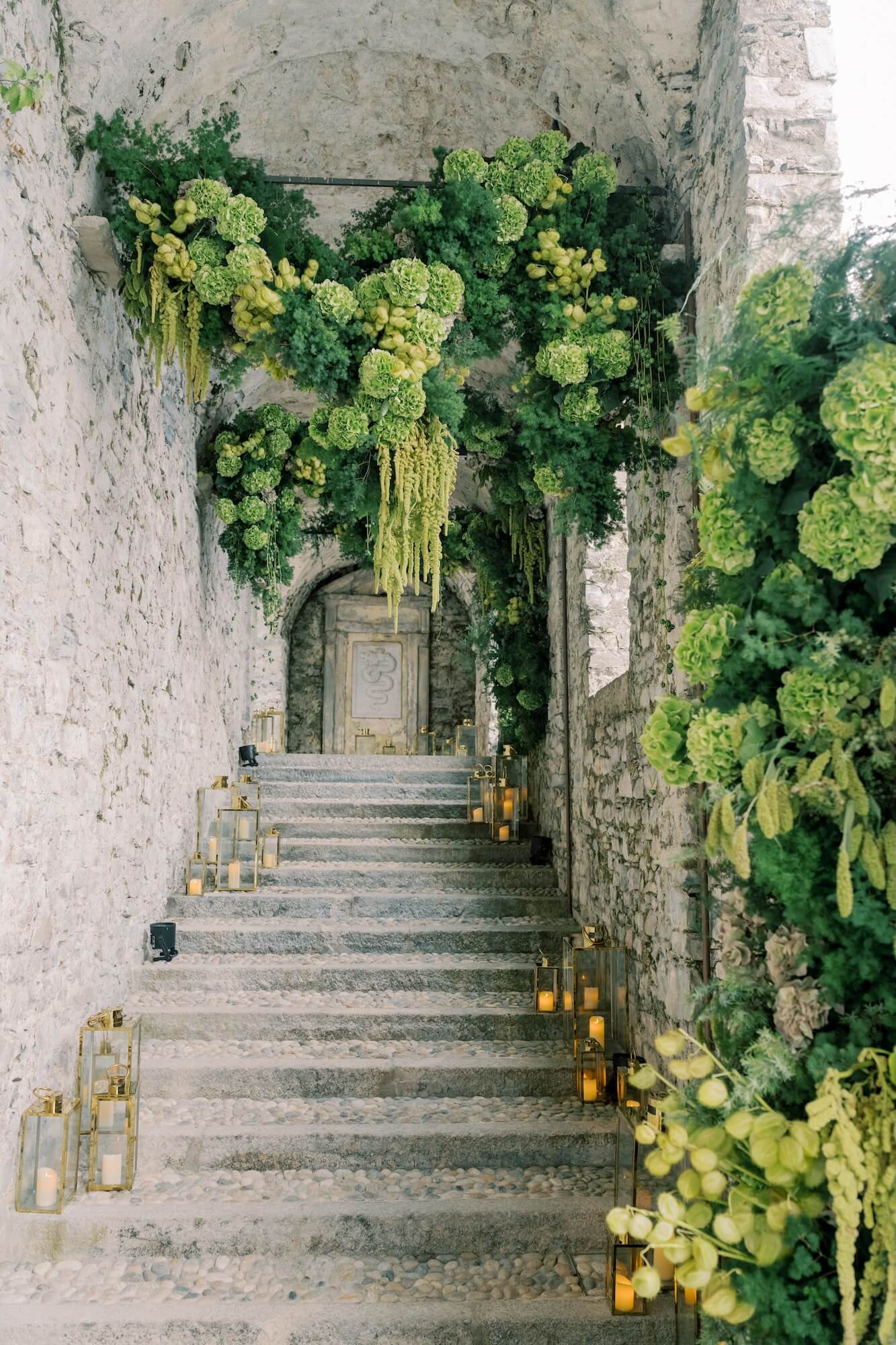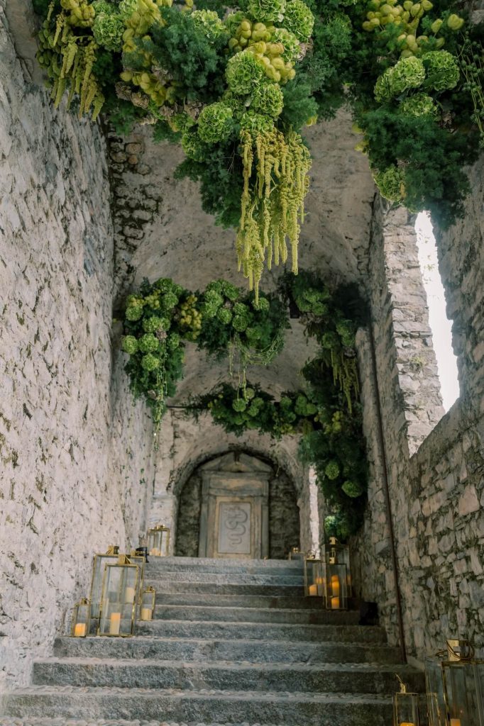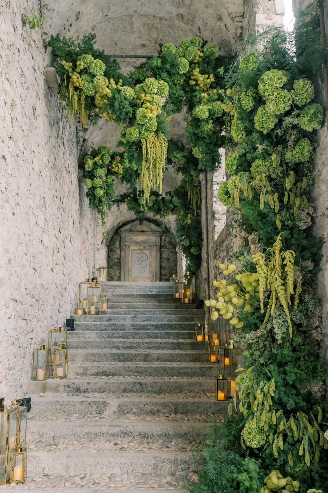 The floral installations were designed to feel immersive and architectural, echoing the rhythm of the villa’s stone staircases and vaulted passageways. Sweeping garlands of foliage, clusters of hydrangea, trailing amaranthus, and delicate grasses were arranged to cascade from overhead structures and along ancient stone walls, creating a living canopy of greenery. Lantern-lined stairways glowed beneath these botanical installations, guiding guests through the venue while the flowers appeared to spill effortlessly from the architecture, blurring the boundary between the historic setting and the contemporary floral design.