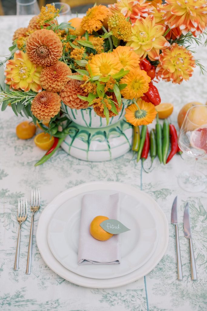 The floral design reflected Larry’s signature approach to creating immersive environments, with generous arrangements of dahlias, marigold-toned blooms, and textural foliage spilling from hand-painted ceramic vessels. These florals were complemented by playful touches of seasonal produce—lemons, kumquats, grapefruits, and vibrant red and green chillies—woven throughout the tablescape to evoke the richness of Tuscan markets. The citrus accents echoed the golden hues of the flowers while adding a fresh, informal charm that perfectly suited the welcoming atmosphere of the evening.