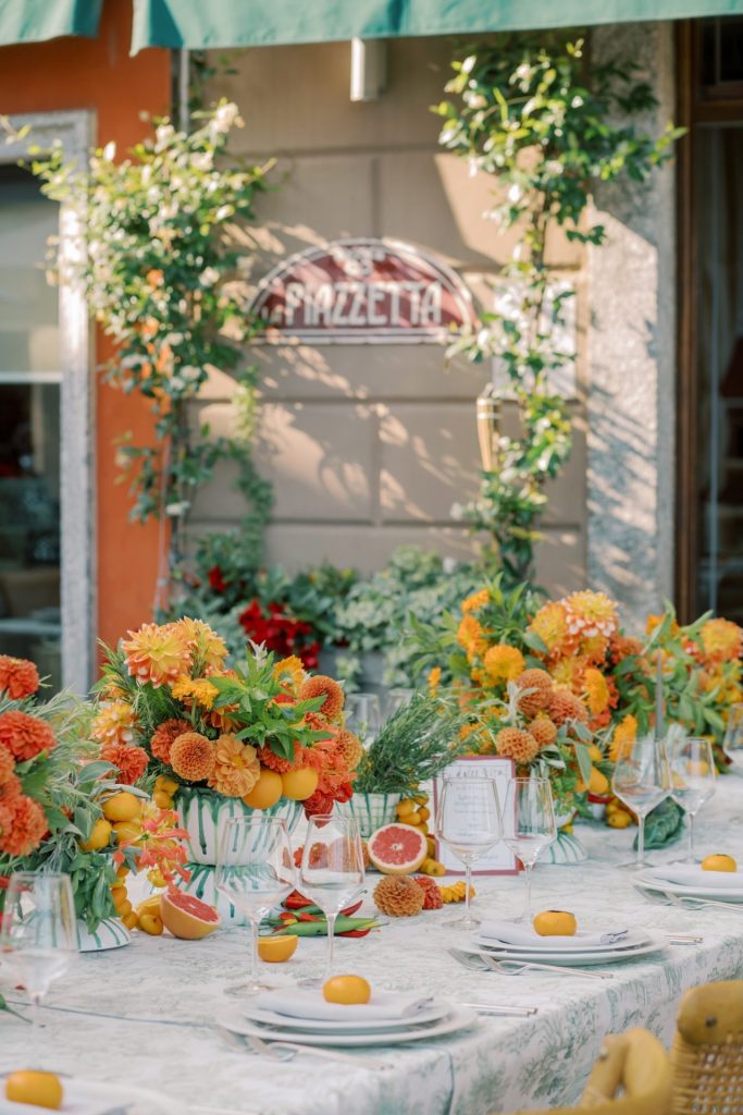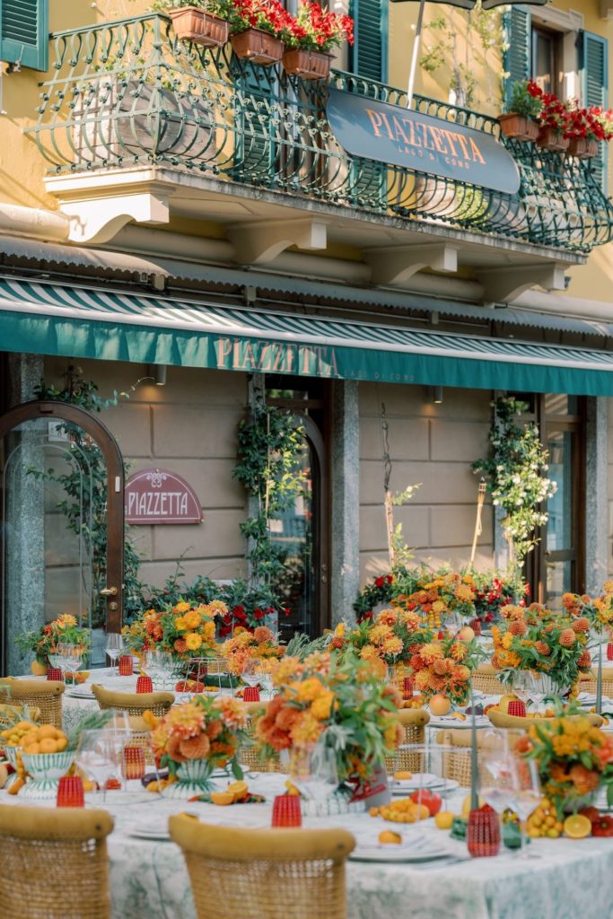 At A Tuscan Welcome Dinner at Fontana Le Ciotole in Piazza Roma, Argegno, Larry Walshe created a vibrant alfresco celebration that captured the relaxed spirit of an Italian summer evening on Lake Como. Drawing inspiration from the warm tones of the surrounding architecture and the charm of a traditional Italian piazza, the design embraced an abundant palette of sun-drenched oranges, citrus yellows, and lush Mediterranean greens.