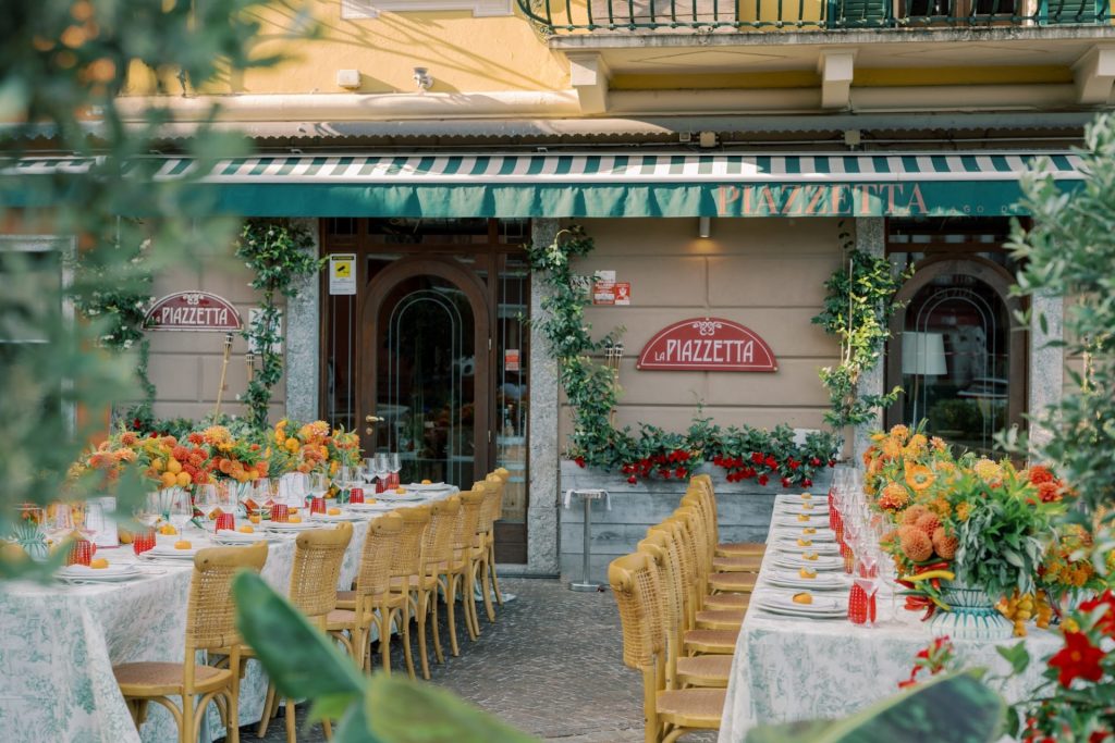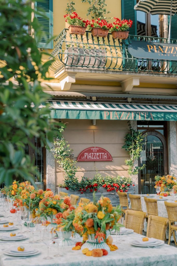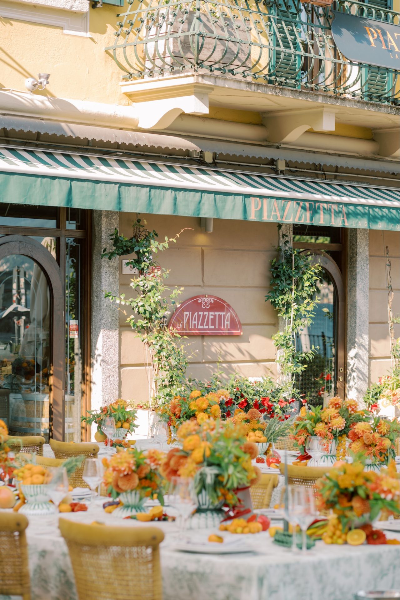 Long tables were dressed in soft toile linens and arranged beneath the striped awnings of La Piazzetta, allowing guests to dine surrounded by the character and colour of the lakeside village.