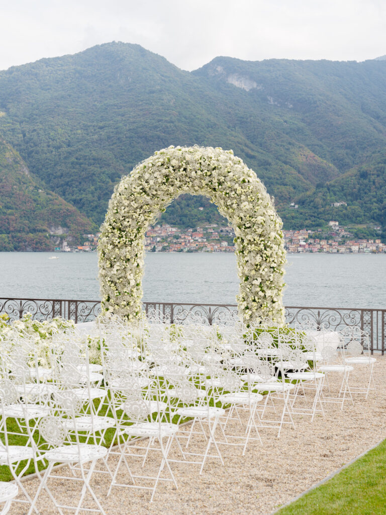 We designed, created and installed wedding ceremony that can only be described as breath-taking. Working along the Lake Como Wedding Planner, we designed the most beautiful and opulent white wedding design using thousands upon thousands of white gypsophila and white spray rose blooms. Floral meadows ran along either side of the aisle whilst a pair of large and luxurious floral arches stood at the start and the end of the aisle. Beautifully timeless, this white wedding provided the perfect backdrop against the iconic Lake Como, ensuring the most beautiful wedding photographs at every turn.