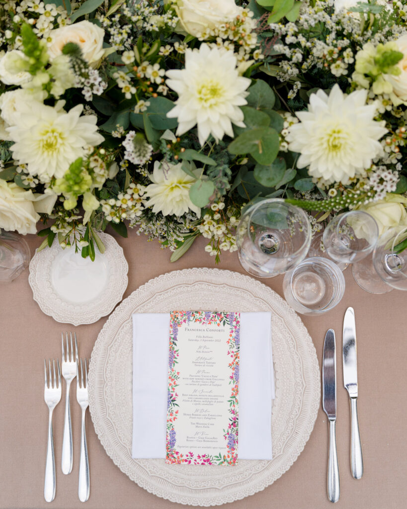 Our bride new exactly what she wanted to create which was super helpful when designing with limited time. Her vision for the wedding was a crisp white wedding ceremony, packed full of fresh flowers. Guests would then move to the front of Villa Balbiano for aperitivo cocktails before motioning around to the glass orangery marquee next to the swimming pool. Here, our bride and groom were keen to create an elegant garden inspired wedding setting filled with green and white flowers.