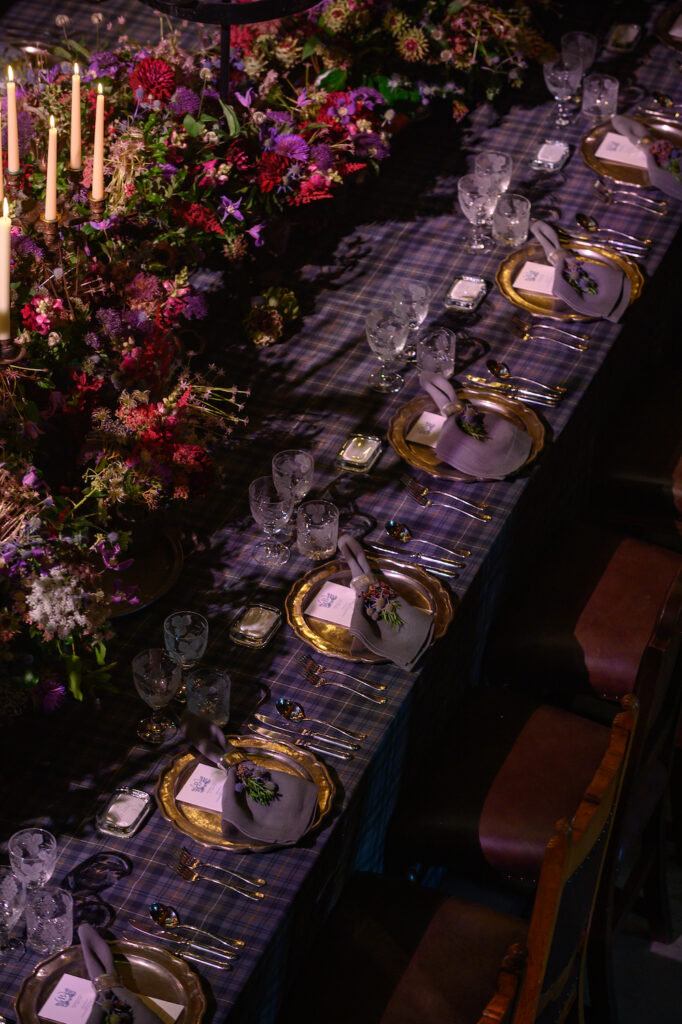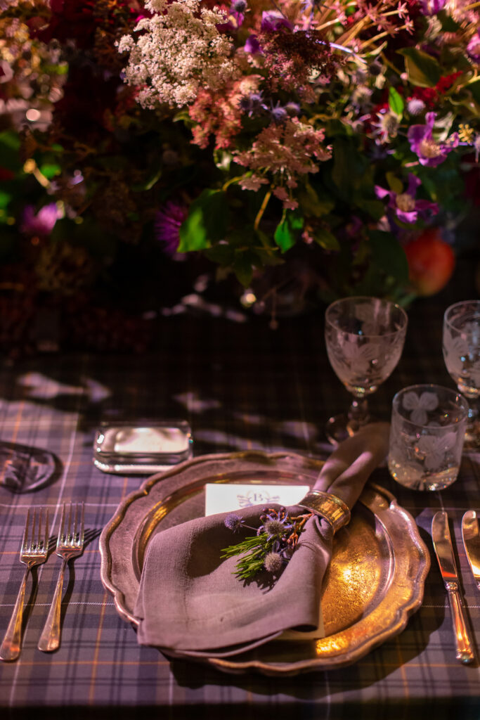 For the birthday celebration, we designed a birthday party with Scottish heritage and flair. One central banquet table for all the guests was adorned by a custom-made tartan linen. Antique pewter vessels, vases and accessories were selected to provide a sense of authenticity within such historic surroundings. Pewter charger plates and pewter napkin rings were then incorporated within the tableware styling to continue the look.