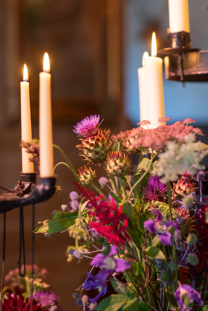 Wrought iron candelabra and other antique candlesticks were then scattered along the table and lavished upon with an organic and textural combination of fruits, vegetables and flowers. A true feasting table, artichokes, pomegranates and grates were scattered amongst jewel coloured floral arrangements befitting of the most royal attendance. Truly sympathetic to the castle interior, this hugely warming scheme was both masculine and extravagant in equal measure.